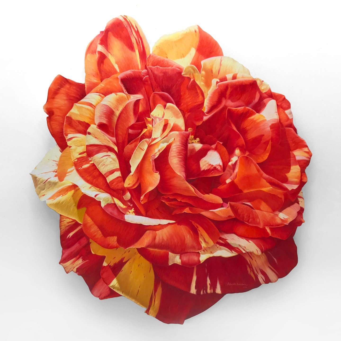 In addition to his semi abstract and impressionistic work, Robert Scriven paints large scale, single blooms or leaves, exquisitely rendered in fine oil on board.